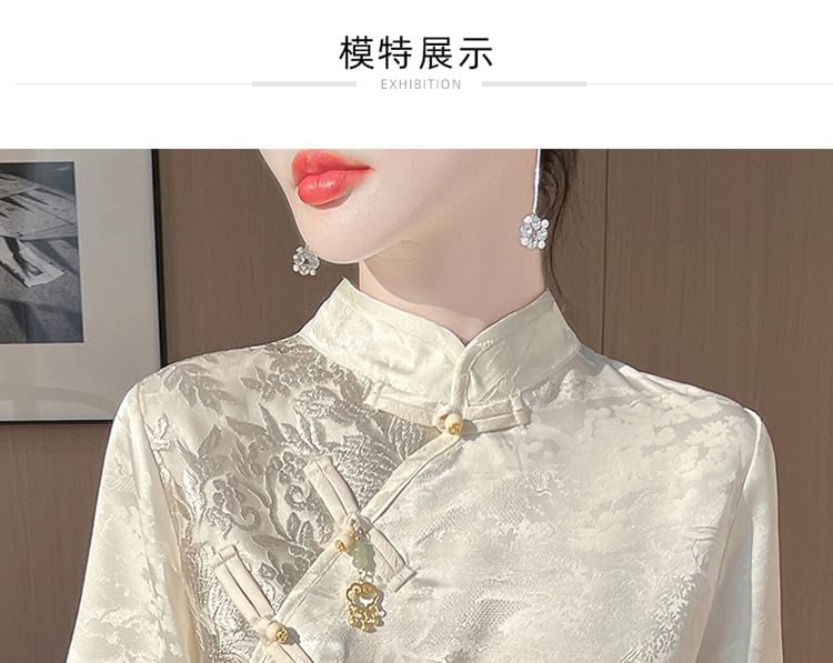 Elbow-Sleeve Stand Collar Frog Buttoned Top
