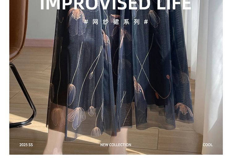 High Rise Floral Print Midi A-Line Mesh Skirt