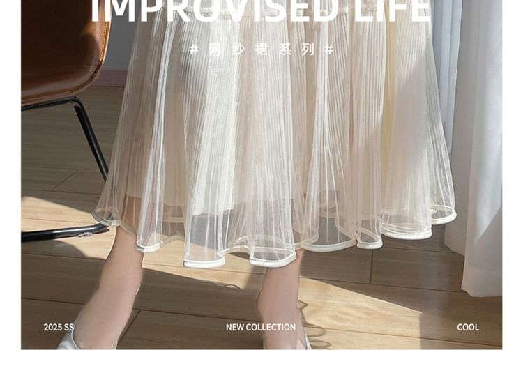 High Waist Plain Accordion Pleat Midi A-Line Mesh Skirt