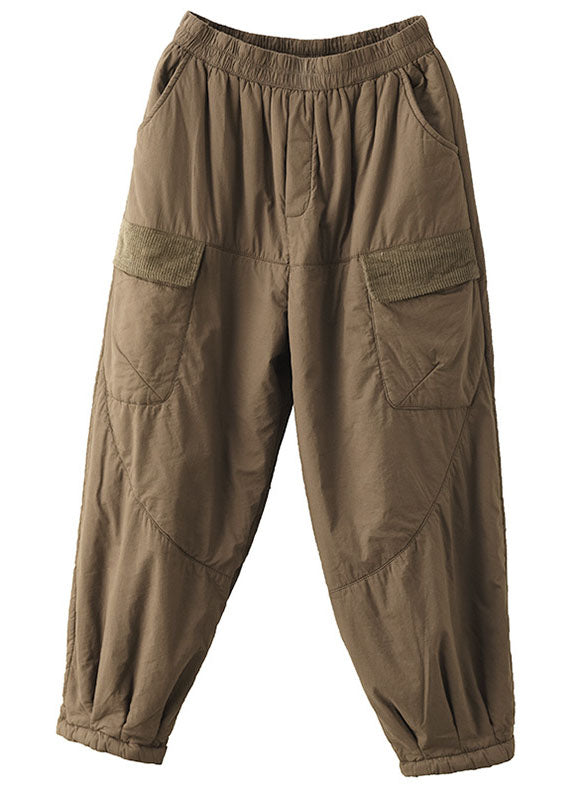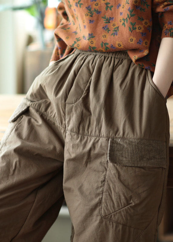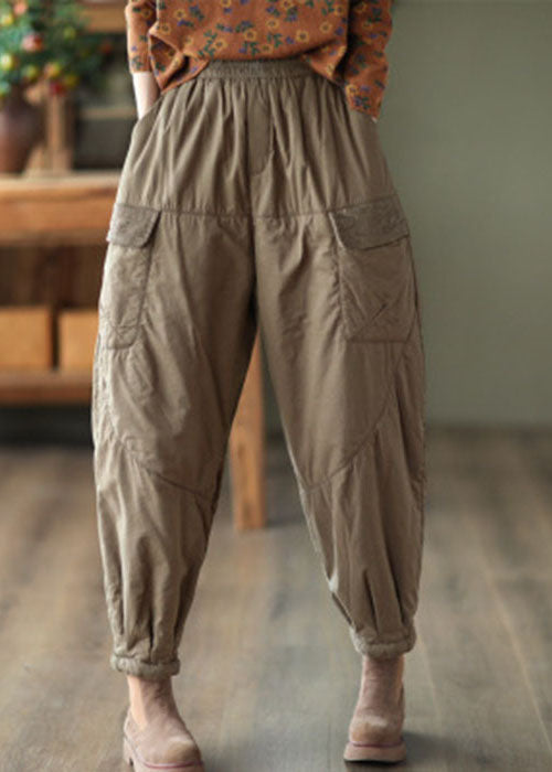 Plus Size Khaki Elastic Waist Patchwork Fine Cotton Filled Harem Pants Winter