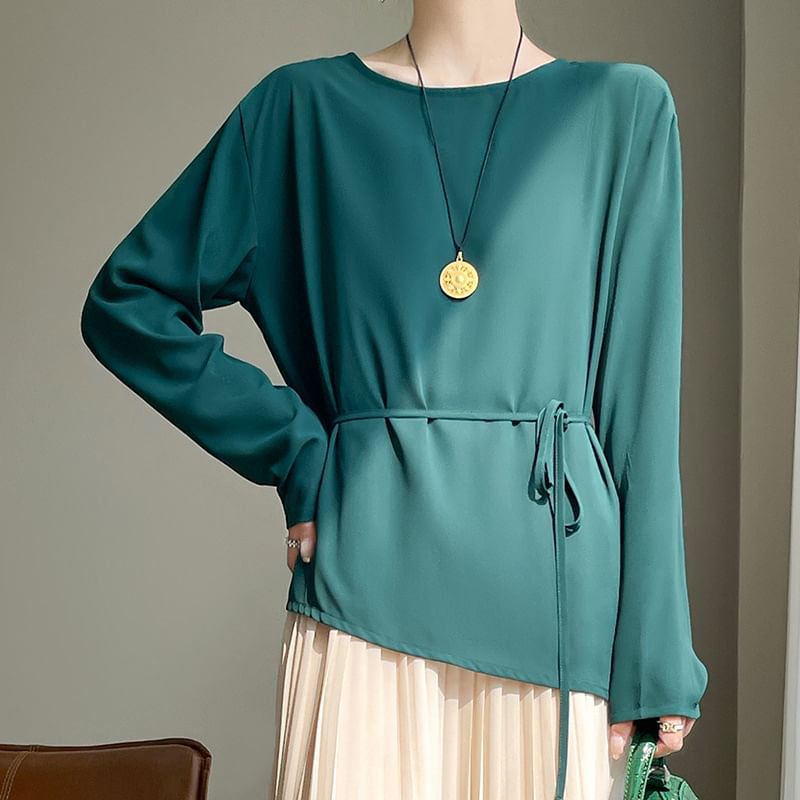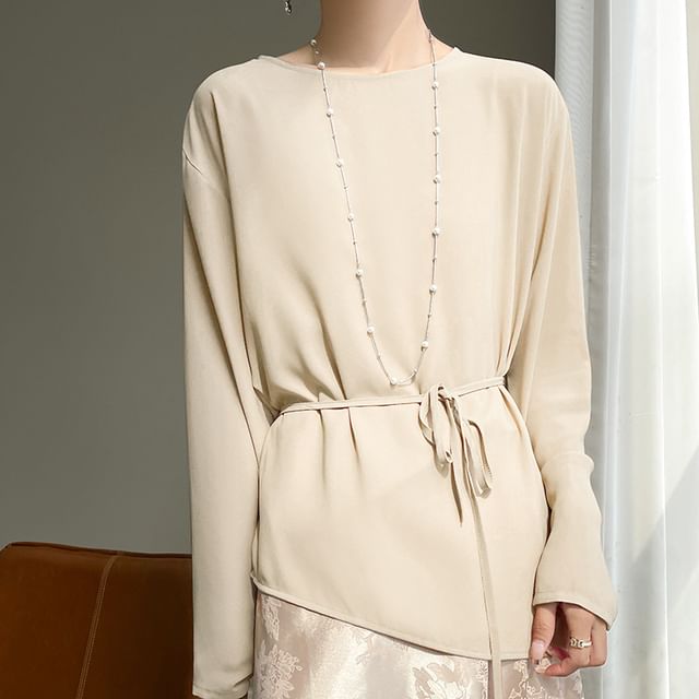 Set: Long-Sleeve Round Neck Plain Asymmetrical Tee + String Belt