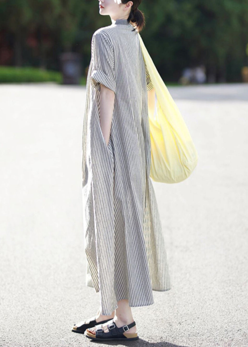 Stand Collar Button Cotton Shirts Striped Casual Dress Summer