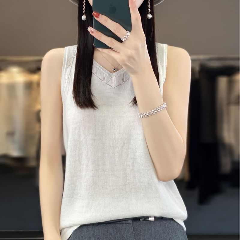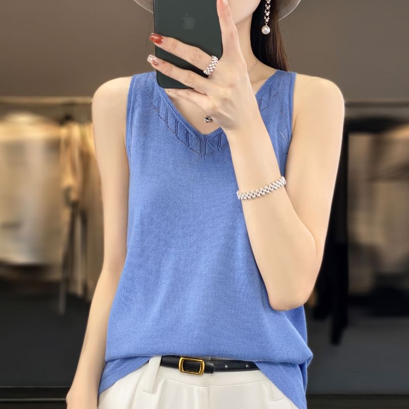 V-Neck Plain Perforated Knit Tank Top