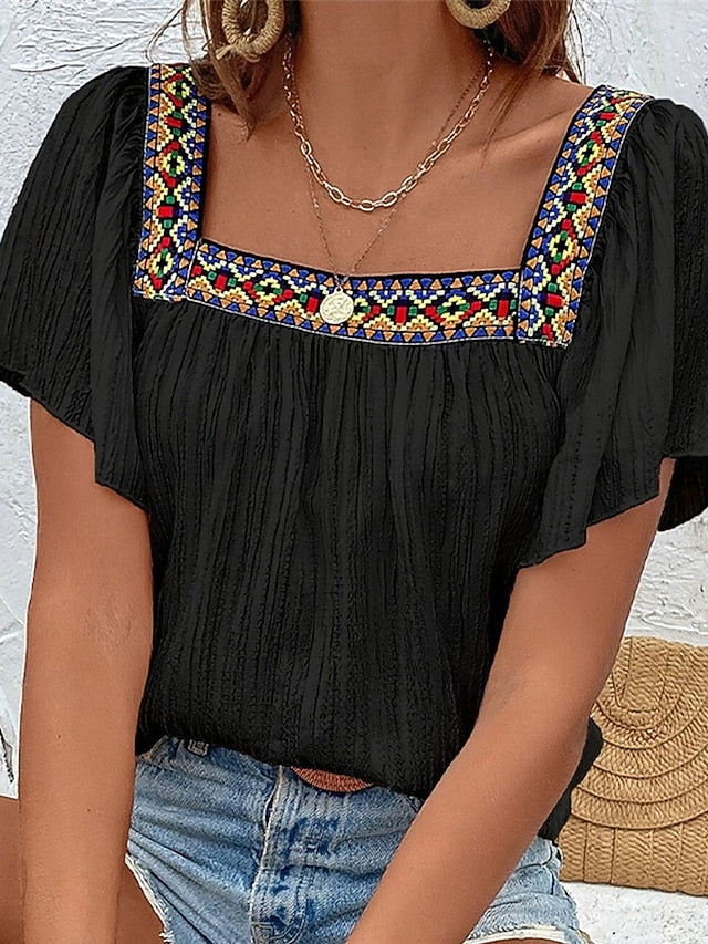 Fabric: Polyester, Tops Type: Dressy Tops, Boho Shirt, Summer Tops, Blouse, Gender: Women's, Design: Print, Ruched, Ruffle, Patchwork, Embroidered, Occasion: Daily, Holiday, Going out, Work, Style: Stylish, Vintage, Casual, Modern, Elegant, Ladies, Pretty, Classic, Category: Blouse, Fit Type: Loose Fit, Neckline: Square Neck, Sleeve Length: Short Sleeve, Elasticity: Inelastic, Look After Me: Washable, Hand wash, Machine wash, Top Length: Regular Tops, Pattern: Plain, Season: Spring, Summer,