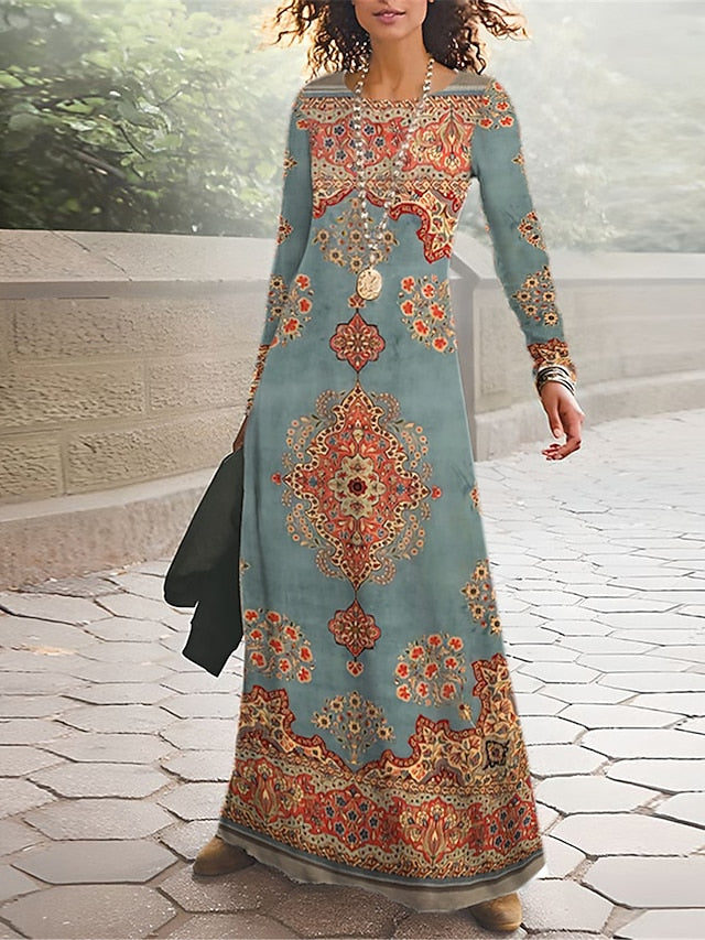 Accessories not included: Accessories not included, Dresses Type: Print Dress, Winter Dress, Casual Dress, Gender: Women's, Fabric: Polyester, Occasion: Going out, Weekend, Outdoor, Daily, Street, Design: Print, Style: Tribal, Ethnic, Vintage, Fit Type: Regular Fit, Dress Length Type: Long Dress Maxi Dress, Neckline: Crew Neck, Sleeve Length: Long Sleeve, Elasticity: Micro-elastic, Look After Me: Machine wash, Pattern: Floral, Tribal, Season: Winter, Spring, Fall, 2025 Trends: 2023,