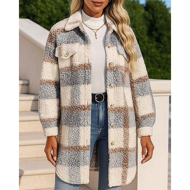 Gender: Women's, Sports Clothing Sub Category: Long Winter Coat, Polar Fleece Jacket, Winter Coat, Clothing Type: Top, Activity: Hiking, Travel, Running, Vacation, Occasion: Workout, Sports, Athleisure, Gyms, Season: Fall / Winter, Fit Type: Regular Fit, Function: Windproof, Warm, Fabric: Polyester, Sleeve Length: Long Sleeve, Design: with Pockets, Neckline: Lapel, Pattern: Plaid Checkered, Look After Me: Wet and Dry Cleaning, Washable, Bust (cm): S:106;M:110;L:116;XL:122, Length (cm): S:92;M:93;L:94;XL:95,