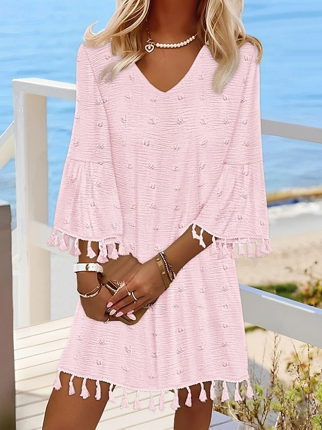 Accessories not included: Accessories not included, Dresses Type: Elegant Dress, Fringe Dress, Gender: Women's, Fabric: Polyester, Design: Fringe, Style: Elegant, Print Type: non-printing, Fit Type: Regular Fit, Dress Length Type: Mini Dress, Neckline: V Neck, Sleeve Length: 3/4 Length Sleeve, Sleeve Type: Bell Sleeve, Elasticity: Inelastic, Look After Me: Machine wash, Pattern: Solid Color, Season: Fall,