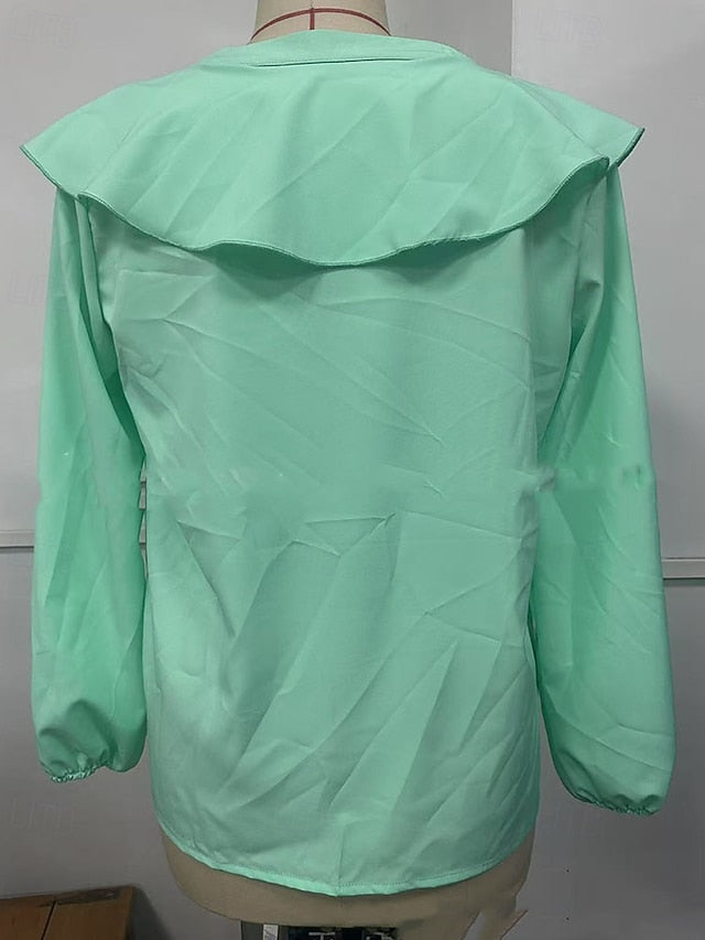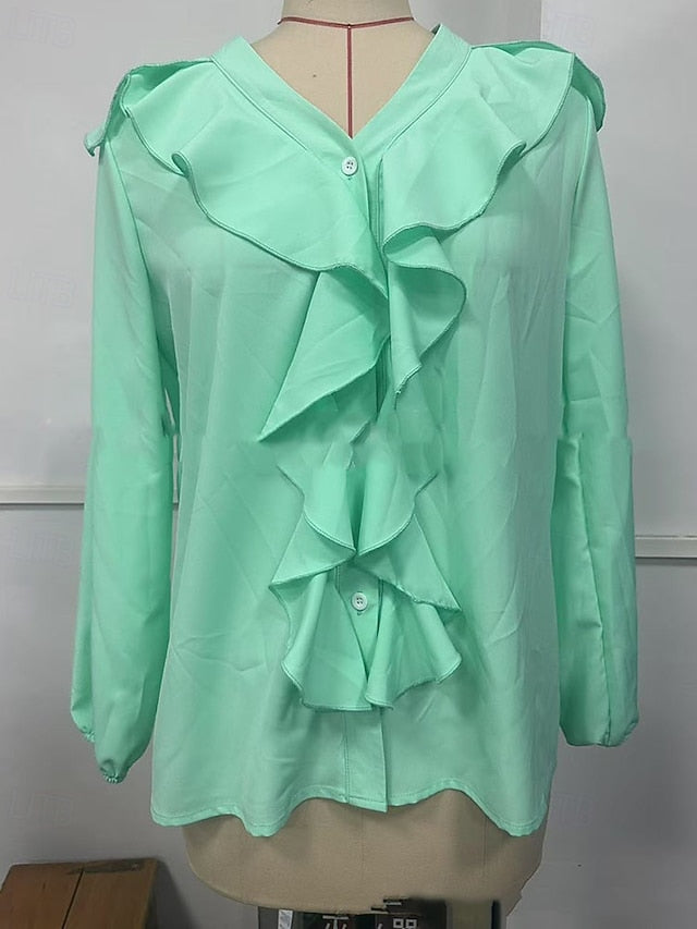 Fabric: Polyester, Tops Type: Shirt, Blouse, Gender: Women's, Occasion: Going out, Daily, Holiday, Design: Ruffle, Style: Stylish, Elegant, Category: Shirt, Fit Type: Regular Fit, Neckline: V Neck, Sleeve Length: Long Sleeve, Elasticity: Micro-elastic, Look After Me: Machine wash, Top Length: Regular Tops, Pattern: Plain, Season: Spring, Fall, Summer,