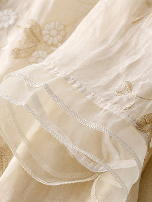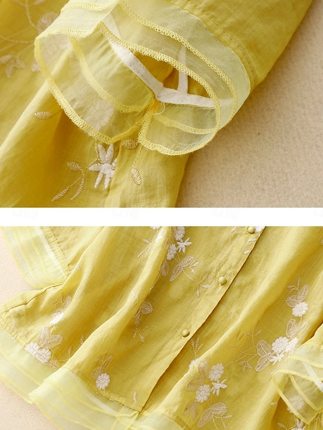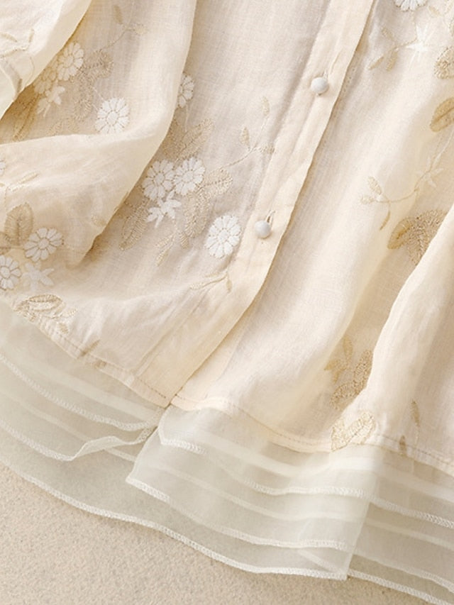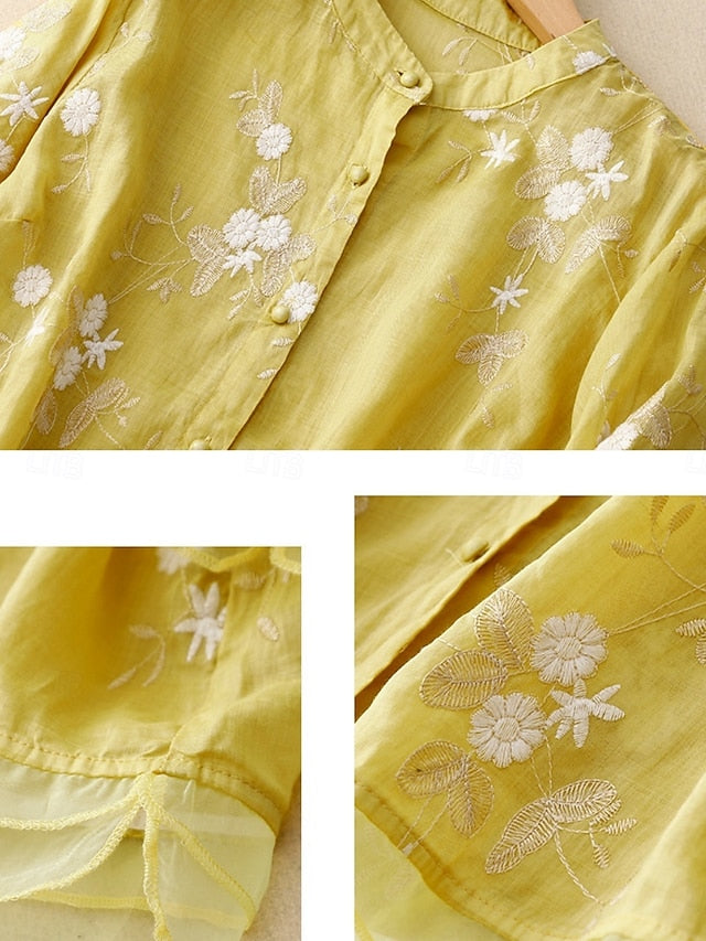 Fabric: Linen texture style, 80%cotton 20%linen, Tops Type: Button Up, Cotton Linen Shirts, Shirt, Blouse, Gender: Women's, Design: Embroidered, Buttons, Occasion: Daily, Style: Casual, Basic, Fit Type: Regular Fit, Neckline: High Neck, Sleeve Length: 3/4 Length Sleeve, Elasticity: Micro-elastic, Look After Me: Hand wash, Machine wash, Top Length: Regular Tops, Pattern: Floral, Season: Summer, Fall, Spring, Fit EU Size: M:38;L:40;XL:42;2XL:44-46, Fit UK Size: M:10;L:12;XL:14;2XL:16-18, Fit US Size: M:6;L:8;XL:10;2XL:12-14,