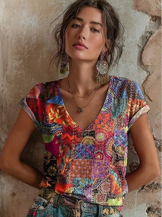 Fabric: Polyester, Tops Type: T Shirt, Gender: Women's, Design: Print, Occasion: Daily, Style: Vintage, Casual, Stylish, Classic, Category: T-Shirt, Fit Type: Form Fit, Neckline: V Neck, Sleeve Length: Short Sleeve, Elasticity: Micro-elastic, Look After Me: Machine wash, Top Length: Regular Tops, Pattern: Graphic, Floral, Season: Spring, Summer,
