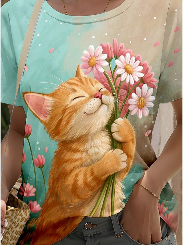 Fabric: Polyester, Gender: Women's, Tops Type: T Shirt, Design: Print, Occasion: Weekend, Going out, Daily, Style: Classic, Stylish, Trendy, Modern, Category: Top, Fit Type: Regular Fit, Neckline: Round Neck, Crew Neck, Sleeve Length: Short Sleeve, Elasticity: Stretchy, Look After Me: Wet and Dry Cleaning, Washable, Machine wash, Top Length: Regular Tops, Pattern: Graphic, Animal, Cat, Season: Spring, Summer,