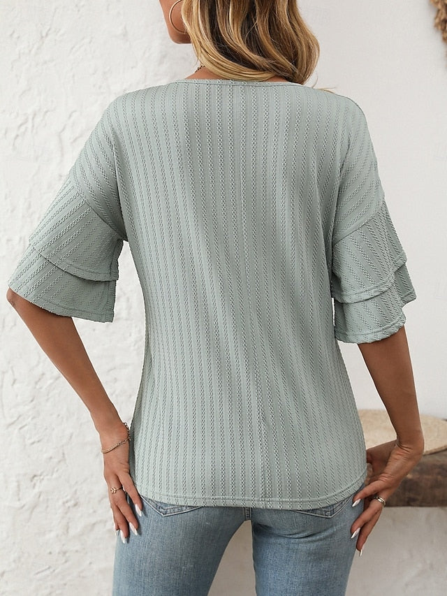 Fabric: Polyester, Tops Type: Tee Top, T Shirt, Gender: Women's, Design: Ruffle, Occasion: Weekend, Going out, Daily, Style: Casual, Fashion, Stylish, Classic, Category: T-Shirt, Fit Type: Regular Fit, Neckline: V Neck, Sleeve Length: Half Sleeve, Elasticity: Micro-elastic, Look After Me: Washable, Hand wash, Machine wash, Top Length: Regular Tops, Pattern: Plain, Season: Spring, Summer,